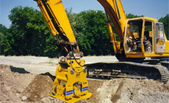 Designed to mount on excavators, and backhoes, hydraulic compactors combine centrifugal force, down pressure, and vibration to work as soil compactors or pile/sheet drivers.